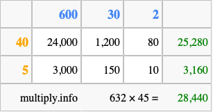 That's all there is to it! As you can see from the box above, the answer to 632 times 45 using the box method is 28,440.
