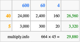That's all there is to it! As you can see from the box above, the answer to 664 times 45 using the box method is 29,880.
