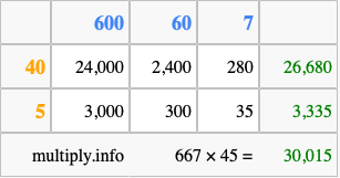 Finally, we add up all the sums we found in step 3 to get our final answer to 667 times 45.