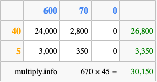 That's all there is to it! As you can see from the box above, the answer to 670 times 45 using the box method is 30,150.
