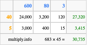 That's all there is to it! As you can see from the box above, the answer to 683 times 45 using the box method is 30,735.