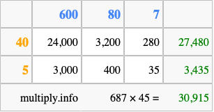 That's all there is to it! As you can see from the box above, the answer to 687 times 45 using the box method is 30,915.