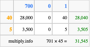 Below is an illustration showing you how to calculate 701 times 45 using the box method, using the instructions above.