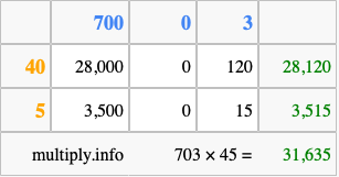 That's all there is to it! As you can see from the box above, the answer to 703 times 45 using the box method is 31,635.