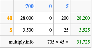 Below is an illustration showing you how to calculate 705 times 45 using the box method, using the instructions above.