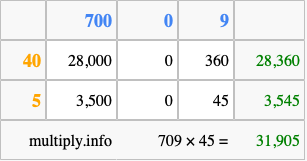 That's all there is to it! As you can see from the box above, the answer to 709 times 45 using the box method is 31,905.
