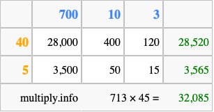 That's all there is to it! As you can see from the box above, the answer to 713 times 45 using the box method is 32,085.