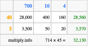 That's all there is to it! As you can see from the box above, the answer to 714 times 45 using the box method is 32,130.