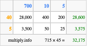 Below is an illustration showing you how to calculate 715 times 45 using the box method, using the instructions above.
