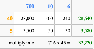 Below is an illustration showing you how to calculate 716 times 45 using the box method, using the instructions above.