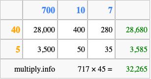Below is an illustration showing you how to calculate 717 times 45 using the box method, using the instructions above.