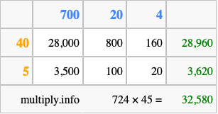 That's all there is to it! As you can see from the box above, the answer to 724 times 45 using the box method is 32,580.
