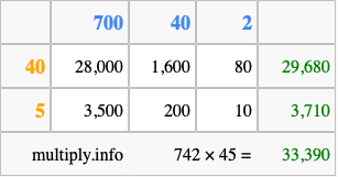 Below is an illustration showing you how to calculate 742 times 45 using the box method, using the instructions above.