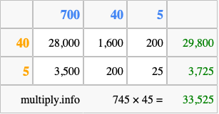 That's all there is to it! As you can see from the box above, the answer to 745 times 45 using the box method is 33,525.