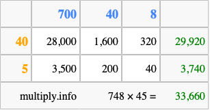 That's all there is to it! As you can see from the box above, the answer to 748 times 45 using the box method is 33,660.