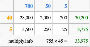 That's all there is to it! As you can see from the box above, the answer to 755 times 45 using the box method is 33,975.
