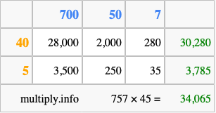 Below is an illustration showing you how to calculate 757 times 45 using the box method, using the instructions above.