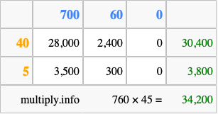 Below is an illustration showing you how to calculate 760 times 45 using the box method, using the instructions above.