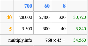 That's all there is to it! As you can see from the box above, the answer to 768 times 45 using the box method is 34,560.