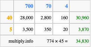 That's all there is to it! As you can see from the box above, the answer to 774 times 45 using the box method is 34,830.