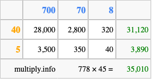 Below is an illustration showing you how to calculate 778 times 45 using the box method, using the instructions above.