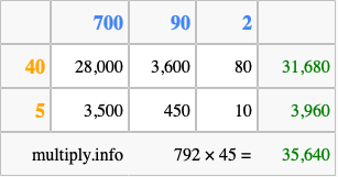 Below is an illustration showing you how to calculate 792 times 45 using the box method, using the instructions above.