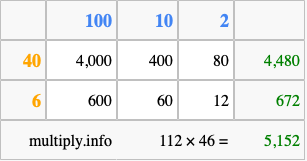 Finally, we add up all the sums we found in step 3 to get our final answer to 112 times 46.