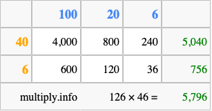 That's all there is to it! As you can see from the box above, the answer to 126 times 46 using the box method is 5,796.