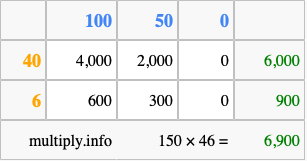 Below is an illustration showing you how to calculate 150 times 46 using the box method, using the instructions above.