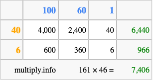 Below is an illustration showing you how to calculate 161 times 46 using the box method, using the instructions above.
