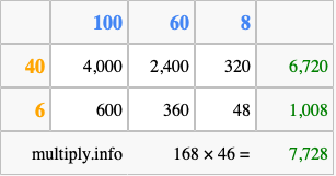 Finally, we add up all the sums we found in step 3 to get our final answer to 168 times 46.