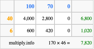 That's all there is to it! As you can see from the box above, the answer to 170 times 46 using the box method is 7,820.