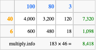 That's all there is to it! As you can see from the box above, the answer to 183 times 46 using the box method is 8,418.