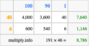 That's all there is to it! As you can see from the box above, the answer to 191 times 46 using the box method is 8,786.