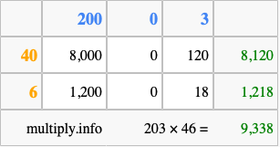 That's all there is to it! As you can see from the box above, the answer to 203 times 46 using the box method is 9,338.