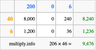 That's all there is to it! As you can see from the box above, the answer to 206 times 46 using the box method is 9,476.