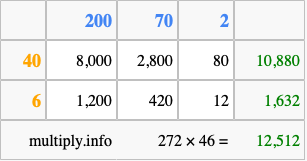 That's all there is to it! As you can see from the box above, the answer to 272 times 46 using the box method is 12,512.