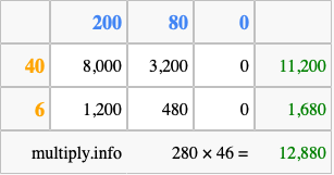 Finally, we add up all the sums we found in step 3 to get our final answer to 280 times 46.