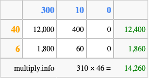 Below is an illustration showing you how to calculate 310 times 46 using the box method, using the instructions above.