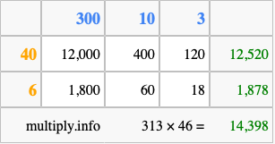 Below is an illustration showing you how to calculate 313 times 46 using the box method, using the instructions above.