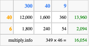 Finally, we add up all the sums we found in step 3 to get our final answer to 349 times 46.