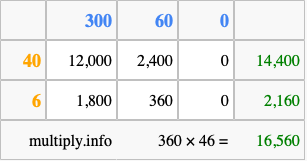 That's all there is to it! As you can see from the box above, the answer to 360 times 46 using the box method is 16,560.