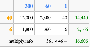 Finally, we add up all the sums we found in step 3 to get our final answer to 361 times 46.