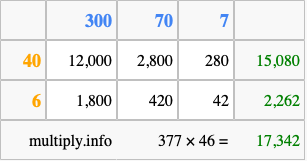 That's all there is to it! As you can see from the box above, the answer to 377 times 46 using the box method is 17,342.