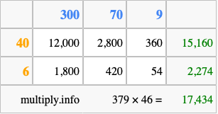 That's all there is to it! As you can see from the box above, the answer to 379 times 46 using the box method is 17,434.