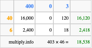 That's all there is to it! As you can see from the box above, the answer to 403 times 46 using the box method is 18,538.