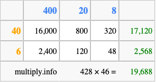 That's all there is to it! As you can see from the box above, the answer to 428 times 46 using the box method is 19,688.