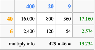 That's all there is to it! As you can see from the box above, the answer to 429 times 46 using the box method is 19,734.