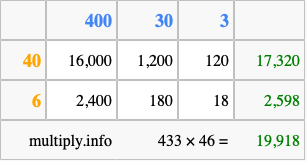 That's all there is to it! As you can see from the box above, the answer to 433 times 46 using the box method is 19,918.