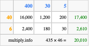 Finally, we add up all the sums we found in step 3 to get our final answer to 435 times 46.